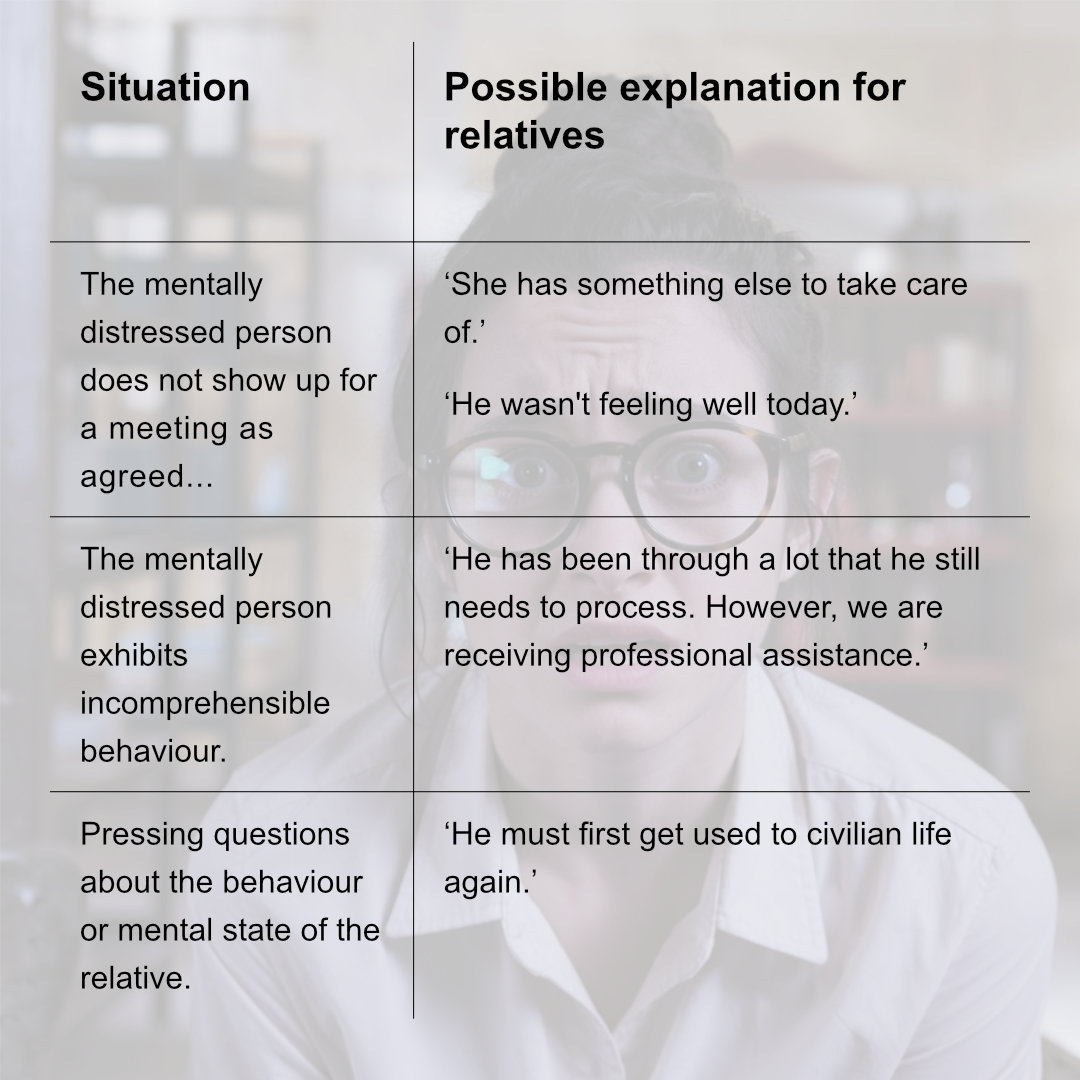 It often happens in partnerships or within the family circle that uncertainties, when it comes to, how the psychological trauma of a soldier should be communicated in contact with other people. Some people show little interest in the affected person's well-being, others constantly expect detailed information and explanations, and still others are irritated when the affected person exhibits incomprehensible behaviour in their presence.